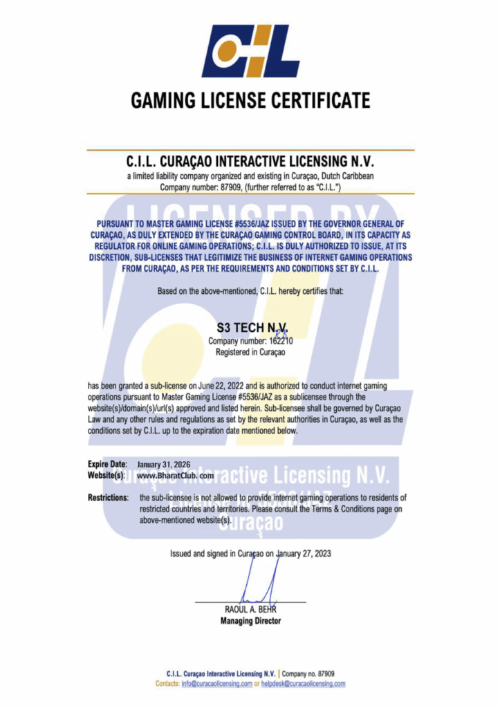 BHT Club, also known as Bharat Club, operates with full legal approval under an official online gaming license issued by Curaçao Interactive Licensing N.V. (C.I.L.L.), a recognized regulatory authority for international gaming services.